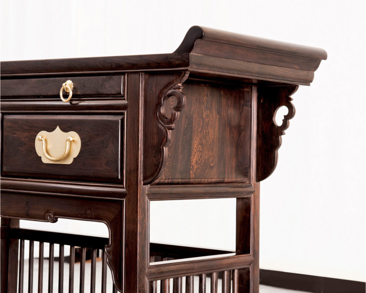 亮格柜的样式以上面亮格带装饰居多。 或三面安券口,或正面安券口加小栏杆,两侧安圈口; 如有抽屉,或露明安在亮格之下,柜门之上,或安在柜门之内。 也有上面全敞的亮格柜,后背板也不用。 但是像这样的翘头亮格带抽屉橱柜几乎找不到旁例, 这是集柜、橱、格三种形式于一体的家具。 通常下层为柜,对开两门,内装膛板分为两格。 柜门之上平设两个个抽屉,是为橱, 再上是空格,三面做一道栅栏围子。 在居室或书房中摆设一对这样的柜, 下侧放置日用杂物,抽屉可存零星小件, 上侧两层空格陈设几件古器,使室内灼耀生辉。